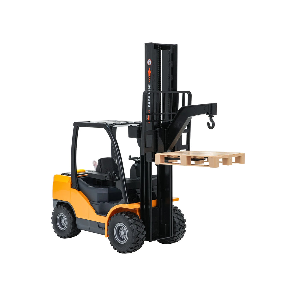 Denne interaktive gaffeltruck med gummidæk og lyd- og lyseffekter er perfekt til børn fra tre år og opefter. Gaffeltrucken betjenes manuelt med et håndsving, der bruges til at hæve og sænke lasten ned på en palle (palle inkluderet). Et panel på bagsiden af gaffeltrucken styrer lydeffekter (bakning, løft, horn) og lyseffekter (blinkende lys på panelet). Legetøjet drives af 3 x AG13-batterier, som medfølger. Alder 3+
