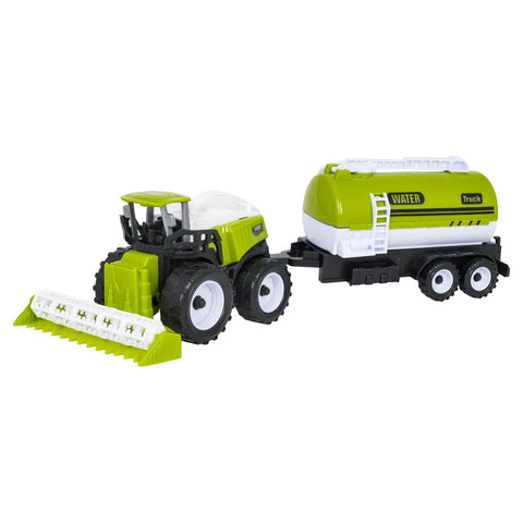 Dette Landbrugs køretøjs sæt er perfekt til børn fra tre år og opefter. Sættet er lavet af plastik af høj kvalitet. Sættet indeholder en Mejetærsker, en Traktor, en Tankvogn og en Anhænger. Køretøjerne er realistisk fremstillet med omhyggelig opmærksomhed på detaljer og har adskillige bevægelige dele. Anhængeren og Tankvognen kan monteres på både Traktoren og Mejetærskeren.
